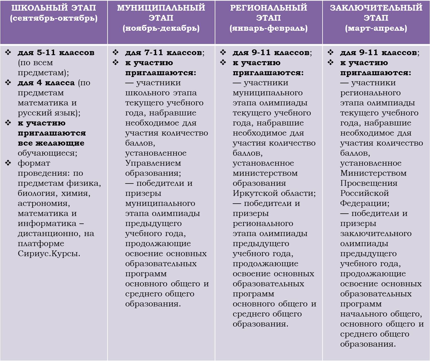 Олимпиада включает школьный, муниципальный, региональный и заключительный этапы.